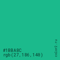 Цвет #1BBA8C в цветовой модели RGB обозначается тремя октетами (27, 186, 140) в десятичном формате и #1BBA8C в шестнадцатиричном (hex) формате, которые являются интенсивностью красного 27 (hex 1B), интенсивность зелёного 186 (hex BA) и интенсивность синего 140 (hex 8C).