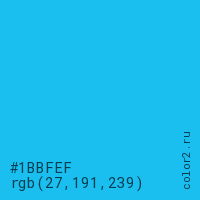 Цвет #1BBFEF в цветовой модели RGB обозначается тремя октетами (27, 191, 239) в десятичном формате и #1BBFEF в шестнадцатиричном (hex) формате, которые являются интенсивностью красного 27 (hex 1B), интенсивность зелёного 191 (hex BF) и интенсивность синего 239 (hex EF).