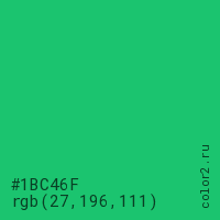 Цвет #1BC46F в цветовой модели RGB обозначается тремя октетами (27, 196, 111) в десятичном формате и #1BC46F в шестнадцатиричном (hex) формате, которые являются интенсивностью красного 27 (hex 1B), интенсивность зелёного 196 (hex C4) и интенсивность синего 111 (hex 6F).