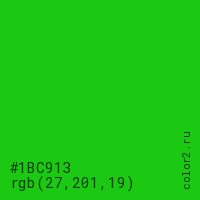 Цвет #1BC913 в цветовой модели RGB обозначается тремя октетами (27, 201, 19) в десятичном формате и #1BC913 в шестнадцатиричном (hex) формате, которые являются интенсивностью красного 27 (hex 1B), интенсивность зелёного 201 (hex C9) и интенсивность синего 19 (hex 13).