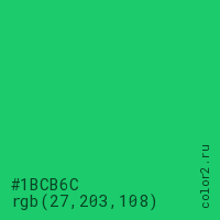 Цвет #1BCB6C в цветовой модели RGB обозначается тремя октетами (27, 203, 108) в десятичном формате и #1BCB6C в шестнадцатиричном (hex) формате, которые являются интенсивностью красного 27 (hex 1B), интенсивность зелёного 203 (hex CB) и интенсивность синего 108 (hex 6C).