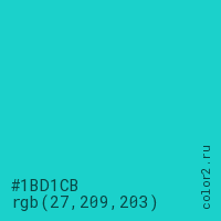 Цвет #1BD1CB в цветовой модели RGB обозначается тремя октетами (27, 209, 203) в десятичном формате и #1BD1CB в шестнадцатиричном (hex) формате, которые являются интенсивностью красного 27 (hex 1B), интенсивность зелёного 209 (hex D1) и интенсивность синего 203 (hex CB).