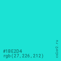 Цвет #1BE2D4 в цветовой модели RGB обозначается тремя октетами (27, 226, 212) в десятичном формате и #1BE2D4 в шестнадцатиричном (hex) формате, которые являются интенсивностью красного 27 (hex 1B), интенсивность зелёного 226 (hex E2) и интенсивность синего 212 (hex D4).