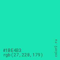 Цвет #1BE4B3 в цветовой модели RGB обозначается тремя октетами (27, 228, 179) в десятичном формате и #1BE4B3 в шестнадцатиричном (hex) формате, которые являются интенсивностью красного 27 (hex 1B), интенсивность зелёного 228 (hex E4) и интенсивность синего 179 (hex B3).
