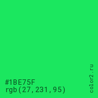 Цвет #1BE75F в цветовой модели RGB обозначается тремя октетами (27, 231, 95) в десятичном формате и #1BE75F в шестнадцатиричном (hex) формате, которые являются интенсивностью красного 27 (hex 1B), интенсивность зелёного 231 (hex E7) и интенсивность синего 95 (hex 5F).