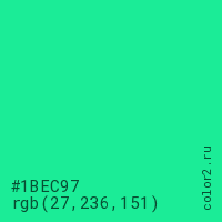 Цвет #1BEC97 в цветовой модели RGB обозначается тремя октетами (27, 236, 151) в десятичном формате и #1BEC97 в шестнадцатиричном (hex) формате, которые являются интенсивностью красного 27 (hex 1B), интенсивность зелёного 236 (hex EC) и интенсивность синего 151 (hex 97).