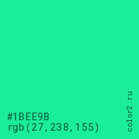 Цвет #1BEE9B в цветовой модели RGB обозначается тремя октетами (27, 238, 155) в десятичном формате и #1BEE9B в шестнадцатиричном (hex) формате, которые являются интенсивностью красного 27 (hex 1B), интенсивность зелёного 238 (hex EE) и интенсивность синего 155 (hex 9B).