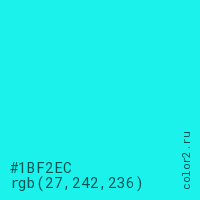 Цвет #1BF2EC в цветовой модели RGB обозначается тремя октетами (27, 242, 236) в десятичном формате и #1BF2EC в шестнадцатиричном (hex) формате, которые являются интенсивностью красного 27 (hex 1B), интенсивность зелёного 242 (hex F2) и интенсивность синего 236 (hex EC).