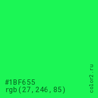 Цвет #1BF655 в цветовой модели RGB обозначается тремя октетами (27, 246, 85) в десятичном формате и #1BF655 в шестнадцатиричном (hex) формате, которые являются интенсивностью красного 27 (hex 1B), интенсивность зелёного 246 (hex F6) и интенсивность синего 85 (hex 55).