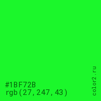 Цвет #1BF72B в цветовой модели RGB обозначается тремя октетами (27, 247, 43) в десятичном формате и #1BF72B в шестнадцатиричном (hex) формате, которые являются интенсивностью красного 27 (hex 1B), интенсивность зелёного 247 (hex F7) и интенсивность синего 43 (hex 2B).