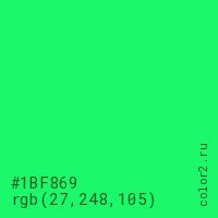 Цвет #1BF869 в цветовой модели RGB обозначается тремя октетами (27, 248, 105) в десятичном формате и #1BF869 в шестнадцатиричном (hex) формате, которые являются интенсивностью красного 27 (hex 1B), интенсивность зелёного 248 (hex F8) и интенсивность синего 105 (hex 69).