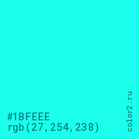 Цвет #1BFEEE в цветовой модели RGB обозначается тремя октетами (27, 254, 238) в десятичном формате и #1BFEEE в шестнадцатиричном (hex) формате, которые являются интенсивностью красного 27 (hex 1B), интенсивность зелёного 254 (hex FE) и интенсивность синего 238 (hex EE).