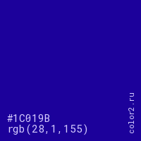 Цвет #1C019B в цветовой модели RGB обозначается тремя октетами (28, 1, 155) в десятичном формате и #1C019B в шестнадцатиричном (hex) формате, которые являются интенсивностью красного 28 (hex 1C), интенсивность зелёного 1 (hex 01) и интенсивность синего 155 (hex 9B).