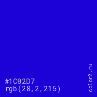 Цвет #1C02D7 в цветовой модели RGB обозначается тремя октетами (28, 2, 215) в десятичном формате и #1C02D7 в шестнадцатиричном (hex) формате, которые являются интенсивностью красного 28 (hex 1C), интенсивность зелёного 2 (hex 02) и интенсивность синего 215 (hex D7).