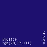 Цвет #1C116F в цветовой модели RGB обозначается тремя октетами (28, 17, 111) в десятичном формате и #1C116F в шестнадцатиричном (hex) формате, которые являются интенсивностью красного 28 (hex 1C), интенсивность зелёного 17 (hex 11) и интенсивность синего 111 (hex 6F).