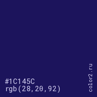 Цвет #1C145C в цветовой модели RGB обозначается тремя октетами (28, 20, 92) в десятичном формате и #1C145C в шестнадцатиричном (hex) формате, которые являются интенсивностью красного 28 (hex 1C), интенсивность зелёного 20 (hex 14) и интенсивность синего 92 (hex 5C).