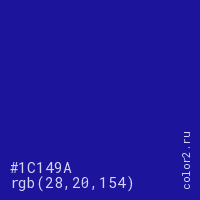 Цвет #1C149A в цветовой модели RGB обозначается тремя октетами (28, 20, 154) в десятичном формате и #1C149A в шестнадцатиричном (hex) формате, которые являются интенсивностью красного 28 (hex 1C), интенсивность зелёного 20 (hex 14) и интенсивность синего 154 (hex 9A).
