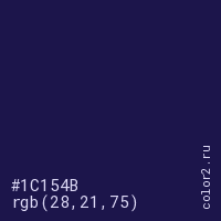 Цвет #1C154B в цветовой модели RGB обозначается тремя октетами (28, 21, 75) в десятичном формате и #1C154B в шестнадцатиричном (hex) формате, которые являются интенсивностью красного 28 (hex 1C), интенсивность зелёного 21 (hex 15) и интенсивность синего 75 (hex 4B).