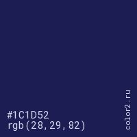 Цвет #1C1D52 в цветовой модели RGB обозначается тремя октетами (28, 29, 82) в десятичном формате и #1C1D52 в шестнадцатиричном (hex) формате, которые являются интенсивностью красного 28 (hex 1C), интенсивность зелёного 29 (hex 1D) и интенсивность синего 82 (hex 52).
