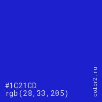 Цвет #1C21CD в цветовой модели RGB обозначается тремя октетами (28, 33, 205) в десятичном формате и #1C21CD в шестнадцатиричном (hex) формате, которые являются интенсивностью красного 28 (hex 1C), интенсивность зелёного 33 (hex 21) и интенсивность синего 205 (hex CD).