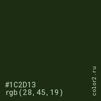 Цвет #1C2D13 в цветовой модели RGB обозначается тремя октетами (28, 45, 19) в десятичном формате и #1C2D13 в шестнадцатиричном (hex) формате, которые являются интенсивностью красного 28 (hex 1C), интенсивность зелёного 45 (hex 2D) и интенсивность синего 19 (hex 13).