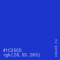 Цвет #1C35CD в цветовой модели RGB обозначается тремя октетами (28, 53, 205) в десятичном формате и #1C35CD в шестнадцатиричном (hex) формате, которые являются интенсивностью красного 28 (hex 1C), интенсивность зелёного 53 (hex 35) и интенсивность синего 205 (hex CD).