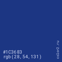 Цвет #1C3683 в цветовой модели RGB обозначается тремя октетами (28, 54, 131) в десятичном формате и #1C3683 в шестнадцатиричном (hex) формате, которые являются интенсивностью красного 28 (hex 1C), интенсивность зелёного 54 (hex 36) и интенсивность синего 131 (hex 83).