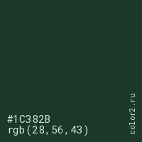 Цвет #1C382B в цветовой модели RGB обозначается тремя октетами (28, 56, 43) в десятичном формате и #1C382B в шестнадцатиричном (hex) формате, которые являются интенсивностью красного 28 (hex 1C), интенсивность зелёного 56 (hex 38) и интенсивность синего 43 (hex 2B).