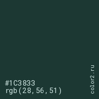 Цвет #1C3833 в цветовой модели RGB обозначается тремя октетами (28, 56, 51) в десятичном формате и #1C3833 в шестнадцатиричном (hex) формате, которые являются интенсивностью красного 28 (hex 1C), интенсивность зелёного 56 (hex 38) и интенсивность синего 51 (hex 33).