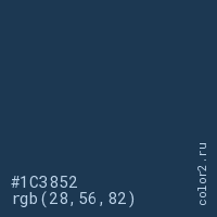 Цвет #1C3852 в цветовой модели RGB обозначается тремя октетами (28, 56, 82) в десятичном формате и #1C3852 в шестнадцатиричном (hex) формате, которые являются интенсивностью красного 28 (hex 1C), интенсивность зелёного 56 (hex 38) и интенсивность синего 82 (hex 52).
