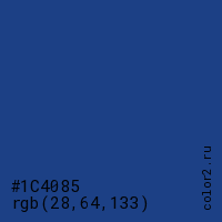 Цвет #1C4085 в цветовой модели RGB обозначается тремя октетами (28, 64, 133) в десятичном формате и #1C4085 в шестнадцатиричном (hex) формате, которые являются интенсивностью красного 28 (hex 1C), интенсивность зелёного 64 (hex 40) и интенсивность синего 133 (hex 85).