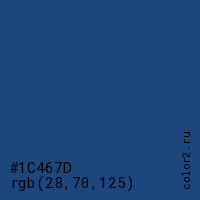 Цвет #1C467D в цветовой модели RGB обозначается тремя октетами (28, 70, 125) в десятичном формате и #1C467D в шестнадцатиричном (hex) формате, которые являются интенсивностью красного 28 (hex 1C), интенсивность зелёного 70 (hex 46) и интенсивность синего 125 (hex 7D).