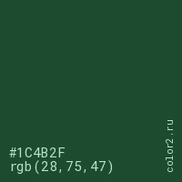 Цвет #1C4B2F в цветовой модели RGB обозначается тремя октетами (28, 75, 47) в десятичном формате и #1C4B2F в шестнадцатиричном (hex) формате, которые являются интенсивностью красного 28 (hex 1C), интенсивность зелёного 75 (hex 4B) и интенсивность синего 47 (hex 2F).