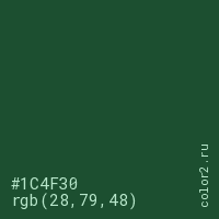 Цвет #1C4F30 в цветовой модели RGB обозначается тремя октетами (28, 79, 48) в десятичном формате и #1C4F30 в шестнадцатиричном (hex) формате, которые являются интенсивностью красного 28 (hex 1C), интенсивность зелёного 79 (hex 4F) и интенсивность синего 48 (hex 30).