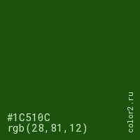 Цвет #1C510C в цветовой модели RGB обозначается тремя октетами (28, 81, 12) в десятичном формате и #1C510C в шестнадцатиричном (hex) формате, которые являются интенсивностью красного 28 (hex 1C), интенсивность зелёного 81 (hex 51) и интенсивность синего 12 (hex 0C).