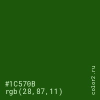 Цвет #1C570B в цветовой модели RGB обозначается тремя октетами (28, 87, 11) в десятичном формате и #1C570B в шестнадцатиричном (hex) формате, которые являются интенсивностью красного 28 (hex 1C), интенсивность зелёного 87 (hex 57) и интенсивность синего 11 (hex 0B).