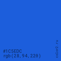 Цвет #1C5EDC в цветовой модели RGB обозначается тремя октетами (28, 94, 220) в десятичном формате и #1C5EDC в шестнадцатиричном (hex) формате, которые являются интенсивностью красного 28 (hex 1C), интенсивность зелёного 94 (hex 5E) и интенсивность синего 220 (hex DC).