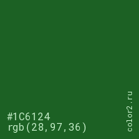 Цвет #1C6124 в цветовой модели RGB обозначается тремя октетами (28, 97, 36) в десятичном формате и #1C6124 в шестнадцатиричном (hex) формате, которые являются интенсивностью красного 28 (hex 1C), интенсивность зелёного 97 (hex 61) и интенсивность синего 36 (hex 24).