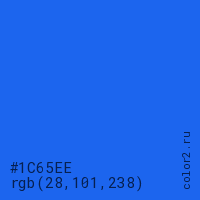 Цвет #1C65EE в цветовой модели RGB обозначается тремя октетами (28, 101, 238) в десятичном формате и #1C65EE в шестнадцатиричном (hex) формате, которые являются интенсивностью красного 28 (hex 1C), интенсивность зелёного 101 (hex 65) и интенсивность синего 238 (hex EE).