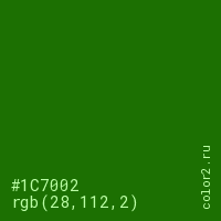 Цвет #1C7002 в цветовой модели RGB обозначается тремя октетами (28, 112, 2) в десятичном формате и #1C7002 в шестнадцатиричном (hex) формате, которые являются интенсивностью красного 28 (hex 1C), интенсивность зелёного 112 (hex 70) и интенсивность синего 2 (hex 02).