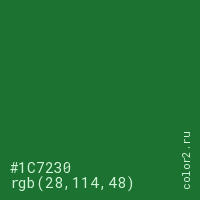 Цвет #1C7230 в цветовой модели RGB обозначается тремя октетами (28, 114, 48) в десятичном формате и #1C7230 в шестнадцатиричном (hex) формате, которые являются интенсивностью красного 28 (hex 1C), интенсивность зелёного 114 (hex 72) и интенсивность синего 48 (hex 30).