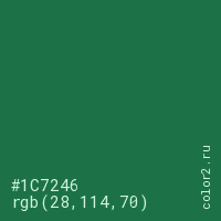 Цвет #1C7246 в цветовой модели RGB обозначается тремя октетами (28, 114, 70) в десятичном формате и #1C7246 в шестнадцатиричном (hex) формате, которые являются интенсивностью красного 28 (hex 1C), интенсивность зелёного 114 (hex 72) и интенсивность синего 70 (hex 46).