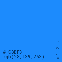 Цвет #1C8BFD в цветовой модели RGB обозначается тремя октетами (28, 139, 253) в десятичном формате и #1C8BFD в шестнадцатиричном (hex) формате, которые являются интенсивностью красного 28 (hex 1C), интенсивность зелёного 139 (hex 8B) и интенсивность синего 253 (hex FD).