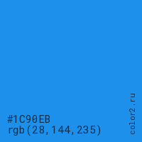 Цвет #1C90EB в цветовой модели RGB обозначается тремя октетами (28, 144, 235) в десятичном формате и #1C90EB в шестнадцатиричном (hex) формате, которые являются интенсивностью красного 28 (hex 1C), интенсивность зелёного 144 (hex 90) и интенсивность синего 235 (hex EB).