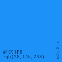 Цвет #1C91F8 в цветовой модели RGB обозначается тремя октетами (28, 145, 248) в десятичном формате и #1C91F8 в шестнадцатиричном (hex) формате, которые являются интенсивностью красного 28 (hex 1C), интенсивность зелёного 145 (hex 91) и интенсивность синего 248 (hex F8).