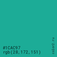 Цвет #1CAC97 в цветовой модели RGB обозначается тремя октетами (28, 172, 151) в десятичном формате и #1CAC97 в шестнадцатиричном (hex) формате, которые являются интенсивностью красного 28 (hex 1C), интенсивность зелёного 172 (hex AC) и интенсивность синего 151 (hex 97).