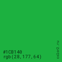 Цвет #1CB140 в цветовой модели RGB обозначается тремя октетами (28, 177, 64) в десятичном формате и #1CB140 в шестнадцатиричном (hex) формате, которые являются интенсивностью красного 28 (hex 1C), интенсивность зелёного 177 (hex B1) и интенсивность синего 64 (hex 40).