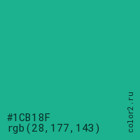 Цвет #1CB18F в цветовой модели RGB обозначается тремя октетами (28, 177, 143) в десятичном формате и #1CB18F в шестнадцатиричном (hex) формате, которые являются интенсивностью красного 28 (hex 1C), интенсивность зелёного 177 (hex B1) и интенсивность синего 143 (hex 8F).