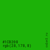 Цвет #1CB208 в цветовой модели RGB обозначается тремя октетами (28, 178, 8) в десятичном формате и #1CB208 в шестнадцатиричном (hex) формате, которые являются интенсивностью красного 28 (hex 1C), интенсивность зелёного 178 (hex B2) и интенсивность синего 8 (hex 08).