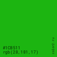 Цвет #1CB511 в цветовой модели RGB обозначается тремя октетами (28, 181, 17) в десятичном формате и #1CB511 в шестнадцатиричном (hex) формате, которые являются интенсивностью красного 28 (hex 1C), интенсивность зелёного 181 (hex B5) и интенсивность синего 17 (hex 11).